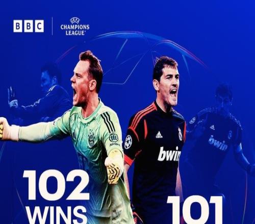 诺伊尔欧冠胜场达102场,超越卡西利亚斯独占门将胜场榜首